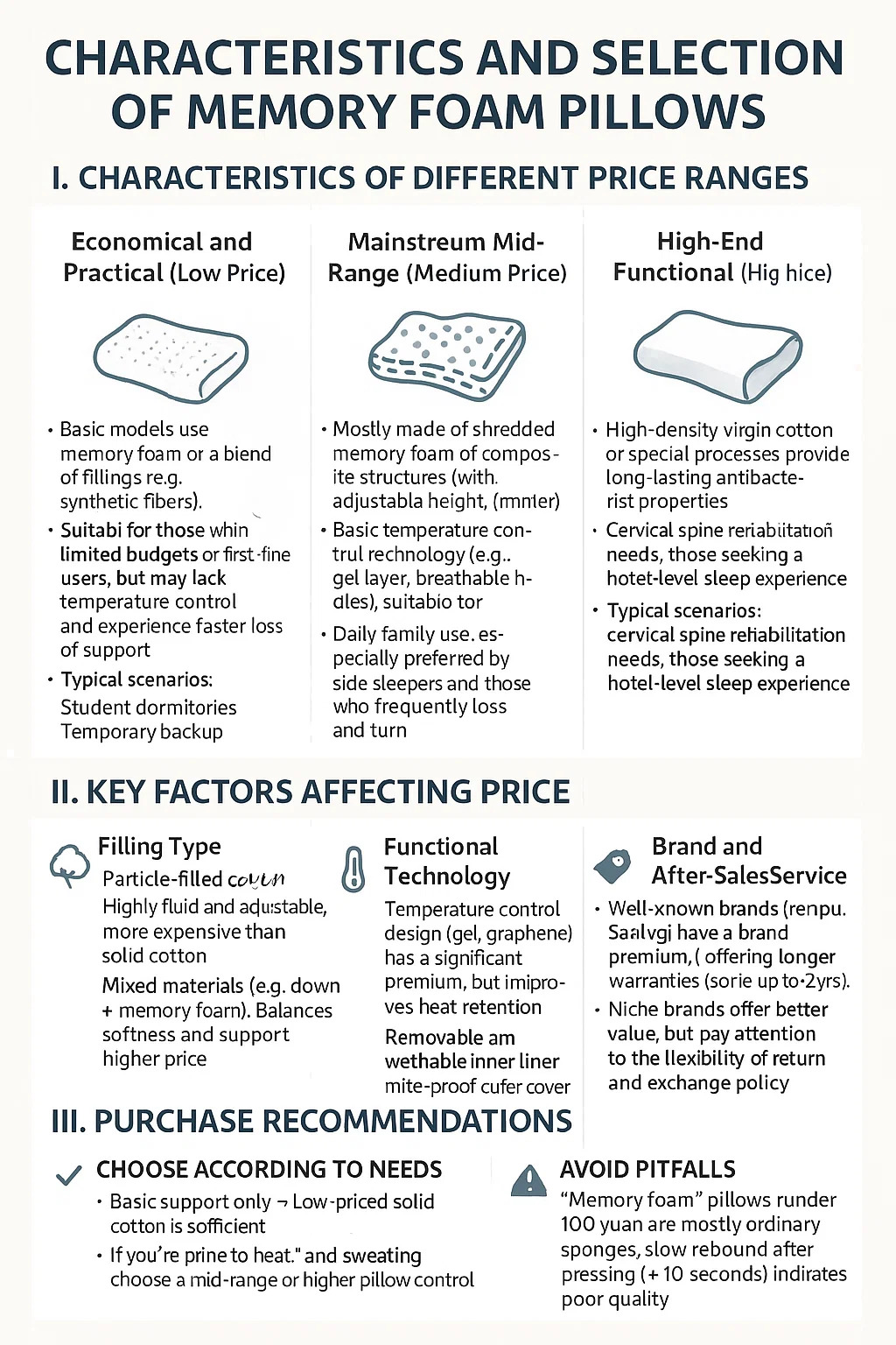 Memory skum puter varierer betydelig i pris, først og fremst påvirket av materialer, funksjoner, merke og design. Nedenfor er en kort forklaring av vanlige prisklasser og deres tilsvarende egenskaper: