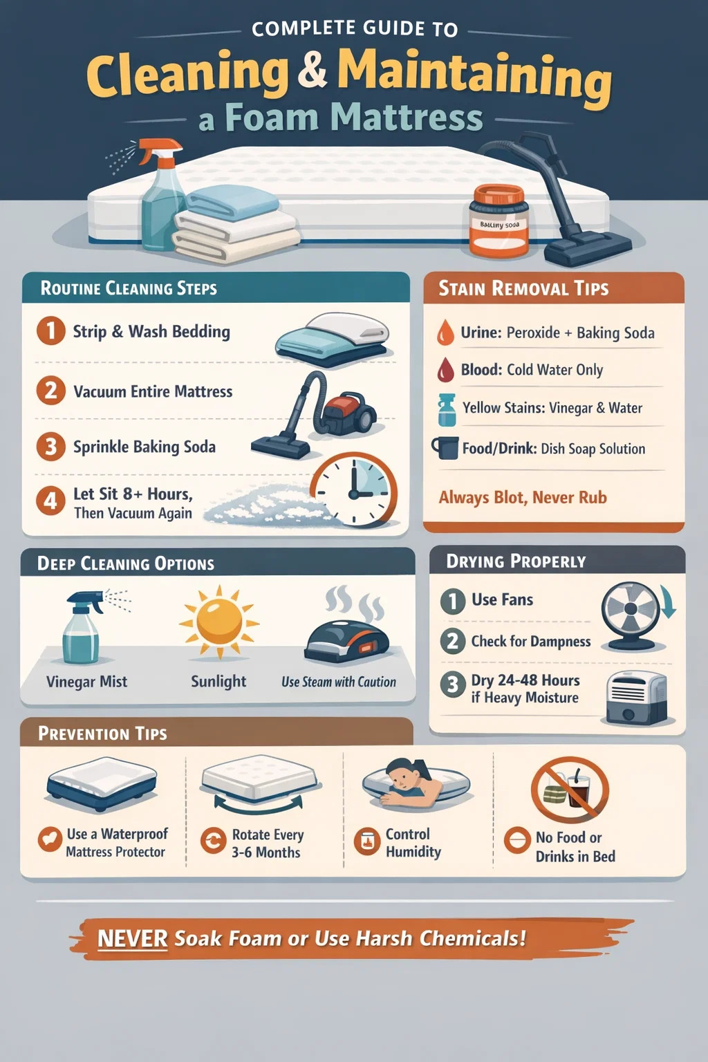 For å rengjøre en skummadrass, stripper du av sengetøyet, støvsug hele overflaten grundig, punktbehandle eventuelle flekker med en blanding av mild oppvaskmiddel og kaldt vann, dryss rikelig med natron over madrassen, la den sitte i minst 8 timer, og støvsug deretter igjen. Bløtlegg aldri en memory foam madrass med vann eller legg den i en vaskemaskin — Dette bryter ned skumcellene permanent og ugyldiggjør de fleste garantier.