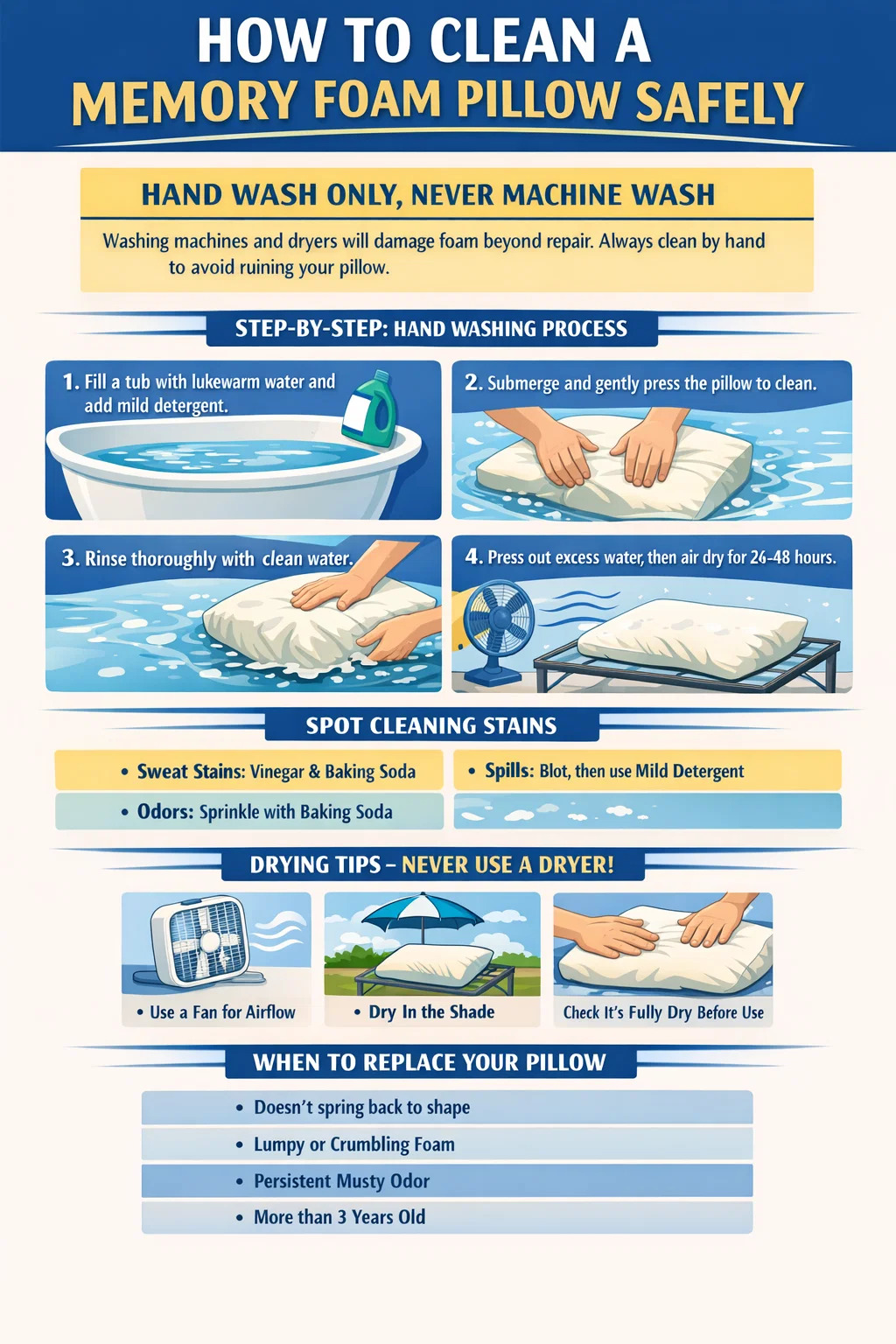 Den viktigste regelen når du rengjør en skumpute - spesielt en minneskumpute - er denne: legg den aldri i vaskemaskin eller tørketrommel . Omrøringssyklusen river skummets åpne cellestruktur fra hverandre, og varmen fra en tørketrommel bryter ned de viskoelastiske forbindelsene som gir memoryskum dens trykkavlastende egenskaper. En pute med minneskum som går gjennom én maskinvask vil aldri gjenopprette sin opprinnelige støtteform.
