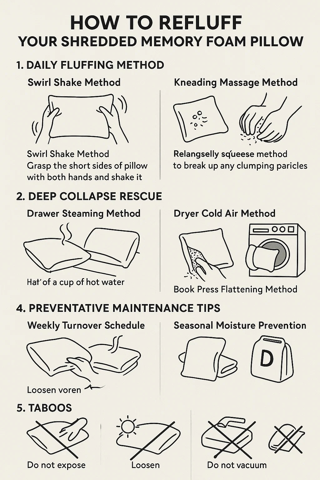 Book Press Flating Method: Legg puten flatt på et håndkle og dekk med en innbundet bok Press over natten. Når du installerer puten på nytt, plasser de mykere partiklene først, deretter de hardere partiklene.